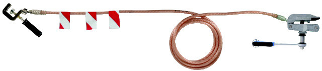 Einpolige Erdungs- und Kurzschließvorrichtung nach DIN VDE 0683-100 (EN/IEC 61230) für Baumaschinen, Hebezeuge und Bahndienstwagen zum Erden an der Schiene des Nachbargleises; 12 m lang, mit Universalklemme, Handgriff aus Kunststoff und Schienenanschlussklemme (Ratsche) bestückt.