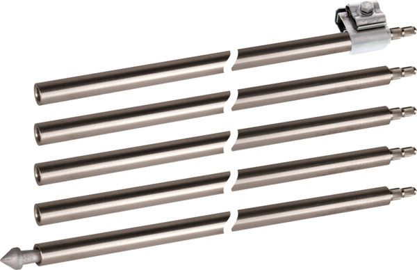 DEHN-Tiefenerder Set D18 014 zusammmensetztbar, mit abgesetztem Rändelzapfen und Bohrung, Ø20 mm. Für Nachrüstung und Neubau geeignet. Bestehend aus 5x Tiefenerder 1m (Art.-Nr. 620 903) + 1x Schlagspitze (Art.-Nr. 620 001) + 1x Anschlussklemme (Art.-Nr. 540 121).