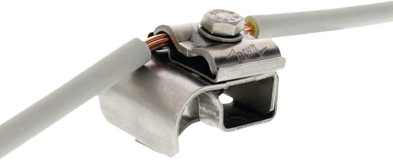 Dachrinnenklemme, zum blitzstromtragfähigen Verbinden bzw. Anschließen der Antennenerdung (z.B. 16 mm2) am Kreuzungspunkt mit bzw. an einer Dachrinne.