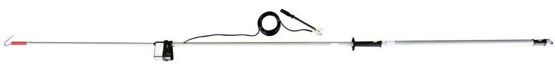 Resistiver, einschenkeliger Gleichspannungsprüfer PHE/G für Fahrdrahtleitungen, Ausführung Pluspol auf Prüfkopf, als zusammengehörige Bauart in Anlehnung an DIN VDE 0682-411 (EN/IEC 61243-1) zum Feststellen der Spannungsfreiheit durch Antasten an der Arbeitsstelle nach DIN VDE 0105-100 (EN 50110-1) in elektrischen Anlagen bis 3 kV DC. Erdseitige Klemme mit Drehgriff. Auch bei Niederschlägen verwendbar.