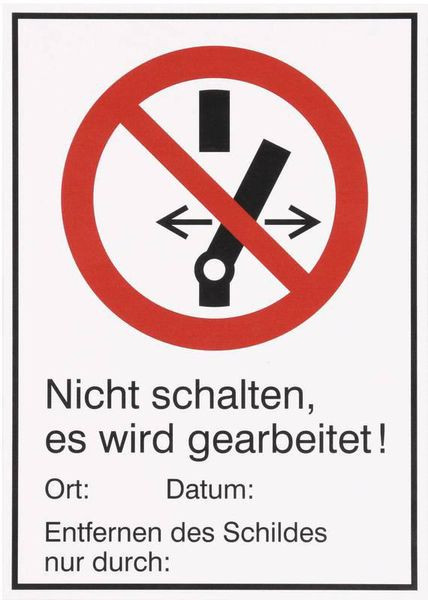Verbotsschild zum Aushang: ""Nicht schalten. Es wird gearbeitet"" nach ASR A1.3 (DIN ISO 7010-P031).