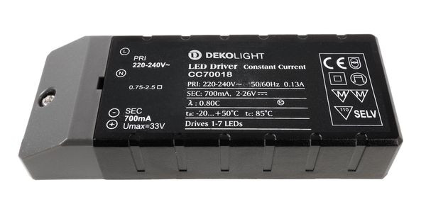 | Kurzbeschreibung | Deko-Light, Netzgerät (CC, DC), BASIC, CC, CC70018/18W, Stromkonstant, 1,4-18,0 W, 220-240 V/AC, Ausgangsspannung: 2-26 V/DC, IP 20 |