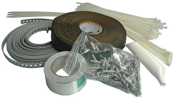 Montagezubehör mit Lochband, Nageldübel, Spannbänder bis NW80, Spannbänder bis NW160, Alu-Klebeband, Iso-Klebeband und Gleitmittel