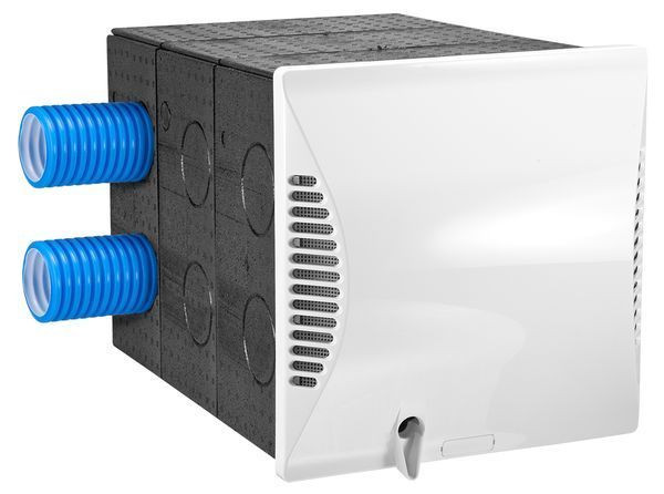 Quadratische Wandhülse aus EPP, 320 x 320 mm, Länge 480 mm, bauseits anzupassen an Wandstärke 420~480 mm, inkl. Zubehör zur Anpassung des Lüftungsgerätes an die Wandstärke (Durchbruch in Außenwand 325 x 325 mm) und UV-beständige Außenwandblende mit Tropfkante aus Kunststoff mit integrierter Kondensatableitung (348 x 365 x 55 mm). Anbindung eines Nebenraumes durch Zuluft- oder Abluftführung mit Lüftungsrohr der Nennweite DN75.