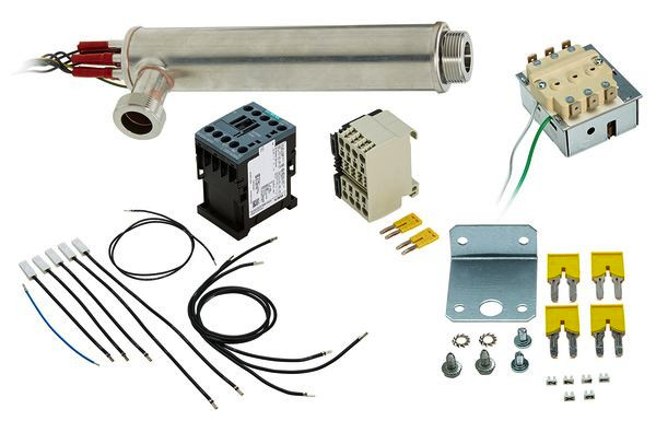 Elektro-Rohrheizkörpersatz zum nachträglichen Einbau in die Luft/Wasser-Wärmepumpe LIK 12TU bei erhöhter elektrischer Heizungs- und Warmwasserbereitung im monoenergetischen Anlagenbetrieb. Bestehend aus einer Rohrheizung (umklemmbar auf 2/4/6 kW), Schaltschütz, Sicherheitstemperaturbegrenzer, vorkonfektionierten Kabelsätzen inkl. Stecker, Durchgangsklemmen, Bezeichnungsschildern und Montagematerial. Anschluss Einbauheizkörper G 1"AG, max. Volumenstrom 2,0 m³/h, Regelbereich 30 - 80 °C.