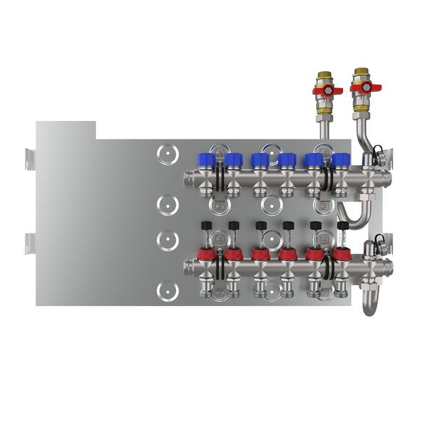 Verteiler aus Edelstahl 1.4301 zur Erweiterung der Trinkwassererwärmungsmodule auf wahlweise 4 bis max. 9 Heiz- oder Kühlkreise für Vor- und Rücklauf. Alle Verteil- und Anschlusskomponenten auf einem Blech vormontiert, dadurch einfacher Anschluss und Einbau in das Schrankmodul (UPG L / APG L) möglich. Verteilerbalken bestehend aus: Durchflussanzeiger 0-3 l/min im Vorlaufverteiler zum hydraulischen Abgleich jedes einzelnen Heizkreises, Absperr- und regulierbarer Durchfluss für jeden Wand- oder Fußbodenheizungskreis im Rücklaufverteiler mit Thermostatventileinsätzen M30x1,5 für die Aufnahme von Stell- bzw. Regelantrieben, Spül-, Füll-, Entleerungsventile und Absperrkugelhähne G ¾“ AG im Vor- und Rücklauf, schallentkoppelte Montage auf dem Grundblech mit gummierten Befestigungsschellen. Anschlussnennweite Heiz- bzw. Kühlkreise G ¾“AG, max. Betriebsdruck 4 bar.