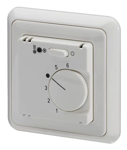 Mechanischer Zweipunkt-Raumtemperaturregler mit Schaltkontakt Wechsler für Heizen / Kühlen in Verbindung mit einer Wärmepumpe. Das Schaltverhalten ?Heizen? oder ?Kühlen? ist mittels Schalter wählbar. Im Kühlbetrieb der Wärmepumpe muss der Raumtemperaturregler manuell auf den Kühlbetrieb eingestellt werden, maßgeblich für Heiz- oder Kühlbetrieb ist immer die Einstellung am Wärmepumpenmanager. Serienmäßig mit Flächenschalterrahmen für UP-Montage, mittels Zwischenrahmen (50 x 50 mm nach DIN 49075) des Flächenschalterprogrammherstellers in nahezu allen Flächenschalterprogrammen einsetzbar (nicht im Lieferumfang enthalten), Regelbereich 5 °C bis 30 °C, Merkziffernskala, Temperaturbereichs-Einengung im Gehäusedeckel, Schaltleistung 230 V / 5 (2) A, Anschluss von bis zu 5 Stellantrieben möglich, IP 30 bei UP-Montage, Farbe alpinweiß (ähnlich RAL 9010). Maße in mm (B x H x T) 81 x 85 x 28,5 (Bauhöhe 16 mm montiert in UP-Dose). Kein Anschluss eines Taupunktfühlers zur Unterbrechung des Kühlbetriebes bei Gefahr von Schwitzwasserbildung möglich, dies muss über eine übergeordnete Regelung erfolgen (z.B. RKS WPM).