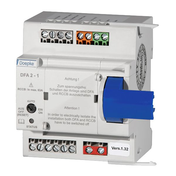 für RCCB bis 063 A: Mit einem Fernantrieb (ARD) werden angeschlossene Fehlerstromschutzschalter aus der Ferne ein- und ausgeschaltet. Die Anlagenverfügbarkeit wird so deutlich erhöht. ARD mit Automatikfunktion schalten den Schutzschalter automatisch wieder ein. Bei einem erkannten Anlagenfehler erfolgt keine Wiedereinschaltung. Die Geräte dieser Baureihe schalten die Doepke-Fehlerstromschutzschalter DFS 2 und DFS 4. Je nach Ausführung machen die DFA drei, einen oder keinen Wiedereinschaltversuch. Sie werden linksseitig an den RCCB angesetzt. Fernantriebe dieser Ausführung schalten den Fehlerstromschutzschalter ein Mal wieder ein. Die Wiedereinschaltung erfolgt 15 Sekunden nach Auslösung. Der Automatikmodus kann ausgeschaltet werden, z. B. zum Schutz bei Wartungsarbeiten in der Verteilung. Die Spannungsversorgung erfolgt wahlweise mit 24 V AC oder DC. Zudem ist eine Fernauslösung durch eine Fehlerstromsimulation möglich. Die aktuelle Schaltposition des Schutzschalters ("eingeschaltet", "ausgelöst" bzw. "ausgeschaltet") wird durch drei integrierte Relaisschaltkontakte signalisiert.