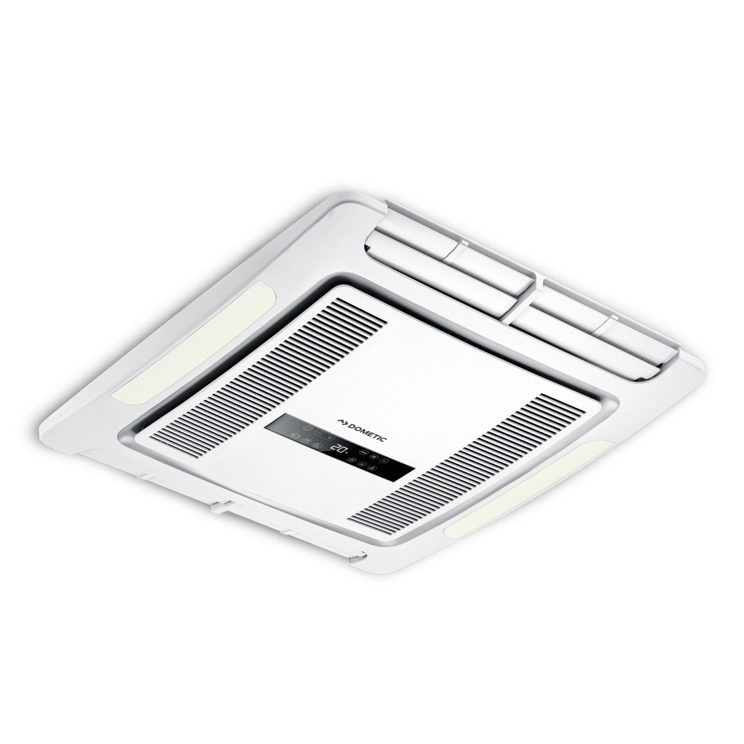 Luftverteilerbox, elektrisches Bedienpanel, LED-Beleuchtung Dieses elegante, besonders flache Luftverteilergerät fügt sich nahtlos in den Innenraum moderner Wohnmobile ein. Es bewegt die Luft geräuscharm und effizient in zwei Richtungen: nach vorne und nach hinten. Nutzen Sie das bündig in die Geräteoberfläche integrierte Touch-Bedienpanel, um die gewünschte Temperatur und die Gebläsestufe einzustellen. So sind Ihnen unvergessliche Momente in Ihrem rollenden Zuhause sicher. Die integrierten LEDs erzeugen ein warmes und sanftes Umgebungslicht.