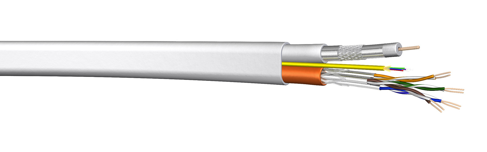 UC HOME Coax10 A+ UC900 HS23+4xBBXS 500DW, UC Home Hybridkabel bestehend aus vier biegeunempfindlichen Singlemodeglasfasern, einem hochgeschirmten dämpfungsarmen Koaxkabel in Schirmungsklasse A+ mit Netzbetreiber-Zulassung und einem Datenkabel UC900 der Kategorie 7, universelles Steigekabel im Geschosswohnungsbau, unter einem Mantel hält es alle Optionen bereit