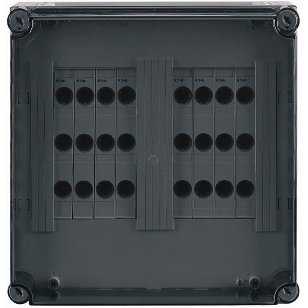 D02 Verteilerschrank mit transparentem Deckel, 8x D02-Reiter-Sicherungssockel auf Sammelschienensystem 630 A, 3-polig, Träger inklusive für N+PE zum Nachrüsten, mit Kupferschienen L1/L2/L3: 30 x 10 mm, N: ohne, PE: ohne, ohne Klemmen, Sicherungsgerät ohne Sicherungen und Schraubkappen.