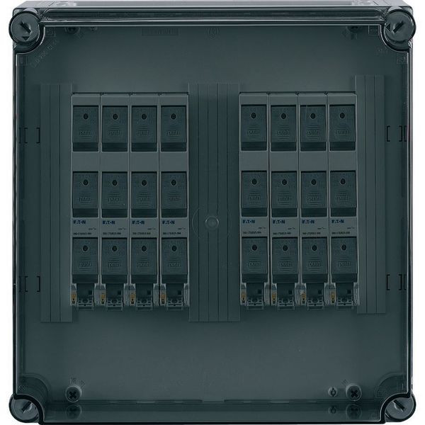 D02 Verteilerschrank mit transparentem Deckel, 8x D02 Lasttrennschalter auf Sammelschienensystem 630 A, 3-polig, Träger inklusive für N+PE zum Nachrüsten, mit Kupferschienen L1/L2/L3: 30 x 10 mm, N: ohne, PE: ohne, ohne Klemmen, Sicherungsgerät mit Schubladen und Blinkfunktion, ohne Schmelzsicherungen.