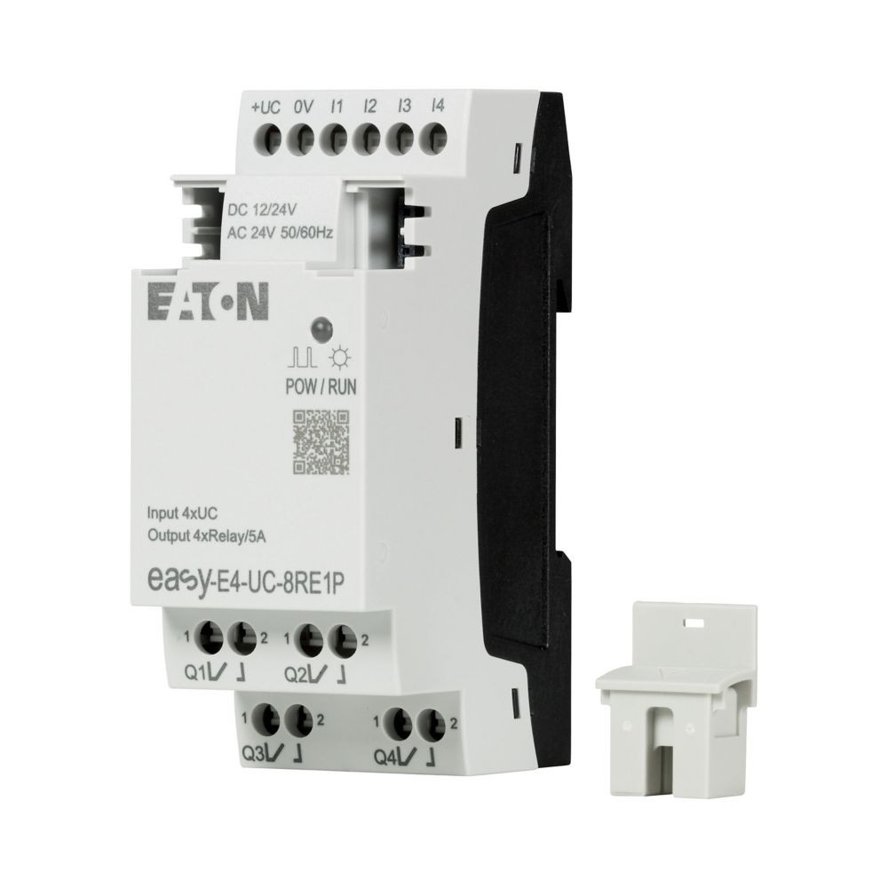 E/A-Erweiterung für Steuerrelais der easyE4-Serie mit einer Nennbetriebsspannung von 12 VDC, 24 V DC oder 24 V AC. Diese Erweiterung bietet 4 Digitaleingänge für 12 V DC, 24 VDC oder 24 VAC und 4 Relaisausgänge für 12-250 VAC oder 12-220 VDC. Die Verbindungen werden über Push-In-Klemmen hergestellt. Der Anschluss an das Steuerrelais oder jede andere Erweiterung der easyE4-Serie erfolgt über den EASY-E4-CONNECT1-Steckverbinder (Artikel 197225), serienmäßig enthalten.
