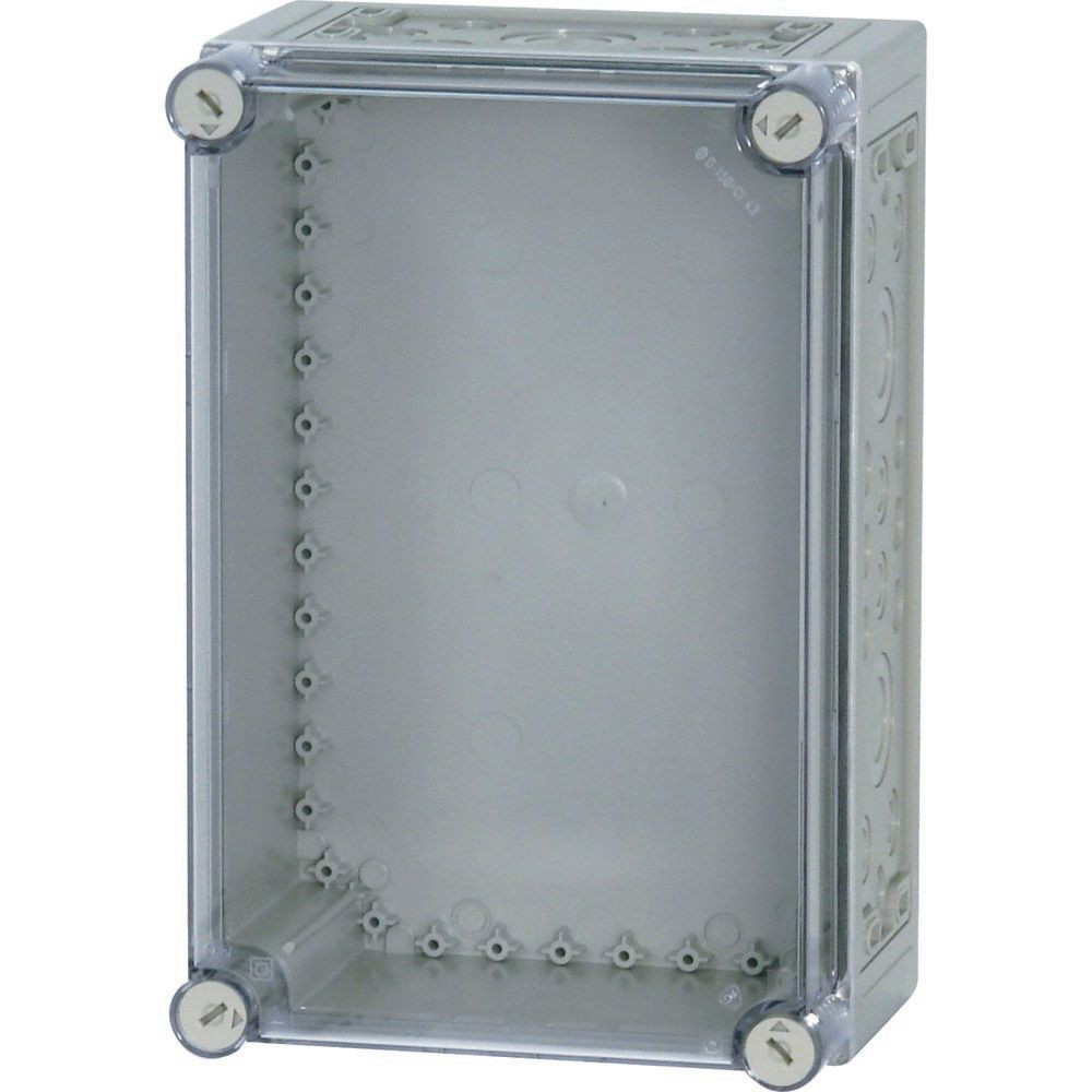 Einzel-Basisgehäuse, Material: Polycarbonat, schlagfest, Schutzart IP65, patentierter Deckelverschluss mit integriertem Überdruckausgleich, mit metrischen Vorprägungen für Kabelführungen an allen Seiten, Leistungseinführungen oben und unten, jeweils = 2x M50/32, 6x M25/16 und 8x M20, jede Seite = 1x M50/32 und 6x M25/16, Befestigungsbänder zur Wandbefestigung, plombierbare Deckelverschlüsse, Seitenwände ausschlagbar, als Verteilergehäuse umbaubar durch Ausschlagen der Seitenwände., RAL 7035, Grau (Sockel), transparent rauchgrau, (Abdeckung), Einbautiefe bei Montageplatte=150mm, Abdeckungstyp: transparent rauchgrau