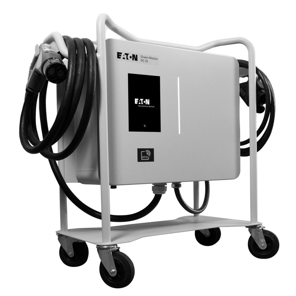 Die Eaton Green Motion DC 22 Mobil ist eine EV-Ladestation, Online, mit CCS-2-Anschluss, RJ45-Kommunikations-Schnittstelle, 4G und RFID-Zugangskontrolle