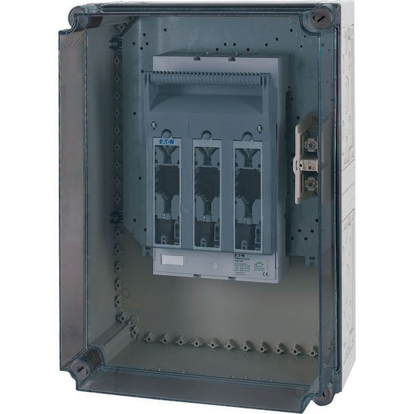 Einzelgehäuse mit 1x NH Sicherungs-Lasttrennschalter, Material Polycarbonat, schlagfest, Schutzart IP65, metrische Vorprägungen an allen Seitenwänden, Sicherungssockel auf Montageplatte aus 3-mm-Stahlblech, Befestigungslasche zur Wandmontage, Plombierbare Deckelverschlüsse, Kappe transparent rauchgrau, Klammer für den Anschluss des 4. Leiters (PE/N), Bemessungsbetriebsstrom Ie = 250 A, Sicherungseinsatz NH1, Nachrüstbare Klemme für den 5. Leiter = K150/1, Sicherungseinsätze müssen einzeln bestellt werden.