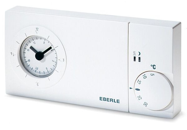 1 We, 16 A Raumregler 24V mit Uhrenfunktion (Tagesschaltuhr) für Wandbefestigung. Eignet sich für die Regelung von Zentral-, Warmwasserfussboden-, Nachtspeicher, Warmluftheizungen usw.. Einfachste Bedienung durch getrennte Einstellung der Tag- und Nachttemperatur. Zusätzlicher Schalter für 3 Programme unter dem Gehäusedeckel, Tag/Automatik/Nacht. Auswählbares Schaltverhalten, Puls-Weiten-Modulation oder 2-Punkt- Regelverfahren. Einstellbare Zyklusdauer von 10 oder 25 Minuten (Summe von Ein- und Auszeit der Puls-Weiten-Modulation). Gangreserve der Uhr bei Stromausfall ca. 100 Stunden. Bereichseinengung im Einstellknopf als Heizkostenbremse. Schaltuhrausgang zur Ansteuerung weiterer Regler mit Temperatur-Absenkung. 2 Kontroll-Lampen, Heizung Ein und Absenkbetrieb.