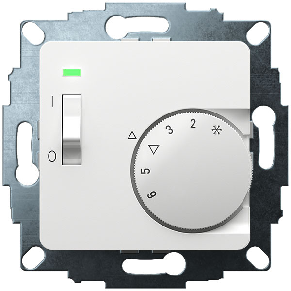 Elektromechanischer Unterputz-Raumtemperaturregler zur Regelung oder Überwachung von Temperaturen in Wohnräumen, Büros und Hotels. Passend in alle gängigen Schalterprogramme. Aktivweiß glänzend, 50x50 Abdeckung mit Knopf. Geeignet für wassergeführte und elektrische Heizsysteme. Durch die thermische Rückführung wird eine sehr kleine Schaltdifferenz erreicht. Bei Beschalten der Uhren-Klemme wird auf eine um ca. 4K geringere Temperatur geregelt. Mit LED-Statusanzeigen. Einstellbare Bereichseinengung im Einstellknopf als Heizkostenbremse. Eine unverlierbare Schraube mit Gewindeeinsatz zur Befestigung des Gehäusedeckels sowie praktische Steckklemmen erleichtert die Montage. Montage in 55er UP-Dose.