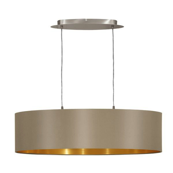 Die Pendelleuchte MASERLO ist mit einem ovalen Lampenschirm aus taupefarbenem Textil und einer nickel-matten Metallaufhängung gefertigt. Kombiniert wurde der Schirm mit einer goldfarbenen Innenseite, die das moderne Design der Hängelampe gekonnt abrundet. Sie fügt sich mit ihrer Größe von 78 cm nahtlos in minimalistische Einrichtungen ein und bietet eine wohnliche Beleuchtung für jeden Raum – egal ob im Wohnzimmer, Schlafzimmer oder im Esszimmer über dem Esstisch. Das Leuchtmittel ist nicht im Lieferumfang enthalten. Geeignet ist die Leuchte für jedes Leuchtmittel mit E27-Sockel.