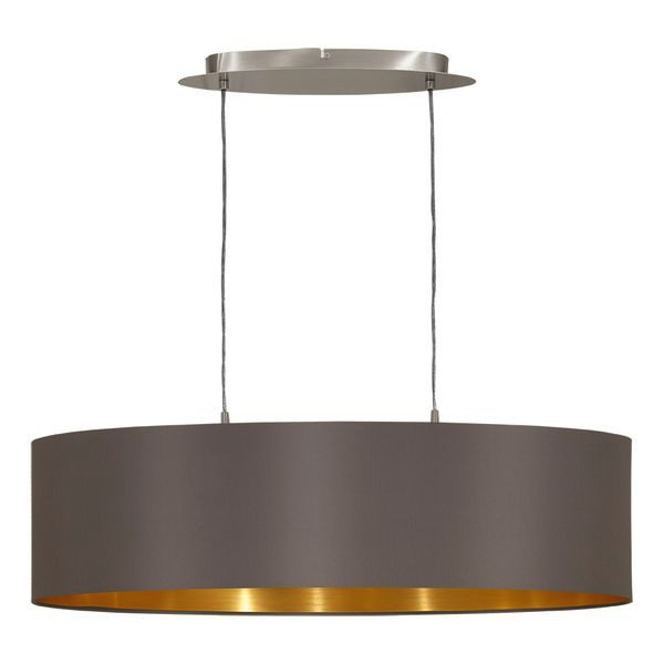 Die Pendelleuchte MASERLO ist mit einem ovalen Lampenschirm aus cappuccinofarbenem Textil und einer nickel-matten Metallaufhängung gefertigt. Kombiniert wurde der Schirm mit einer goldfarbenen Innenseite, die das moderne Design der Hängelampe gekonnt abrundet. Sie fügt sich mit ihrer Größe von 78 cm nahtlos in minimalistische Einrichtungen ein und bietet eine wohnliche Beleuchtung für jeden Raum – egal ob im Wohnzimmer, Schlafzimmer oder im Esszimmer über dem Esstisch. Das Leuchtmittel ist nicht im Lieferumfang enthalten. Geeignet ist die Leuchte für jedes Leuchtmittel mit E27-Sockel.