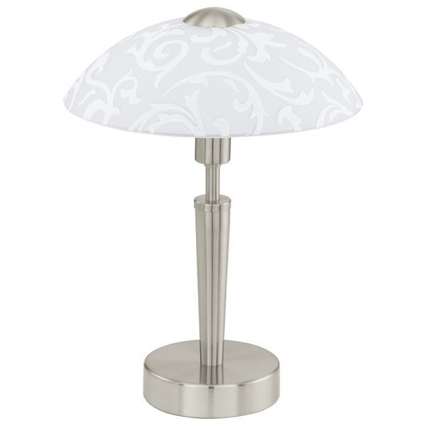 Die Tischleuchte SOLO ist aus einem nickel-matten Metallfuß und einem runden, satinierten Glas-Lampenschirm mit aufgedruckten, geschwungenen Dekor-Elementen in Weiß gefertigt. Die Tischlampe fügt sich durch ihr schlichtes Design in nahezu jede Einrichtung ein und lässt sich bequem über die Berührung am vorgesehenen "Touch me"-Bereich am Leuchtenfuß ein- und ausschalten. Sie bietet eine moderne Beleuchtung für jeden Raum – egal ob im Schlafzimmer auf dem Nachttisch, Wohnzimmer oder Flur. Das Leuchtmittel ist nicht im Lieferumfang enthalten.