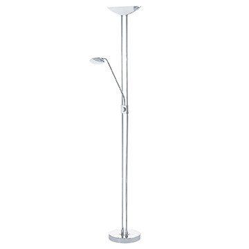 Die LED Stehleuchte BAYA LED ist aus chromfarbenem Metall gefertigt. Der weiße Lampenschirm aus Glas strahlt das Licht an die Decke, sodass eine angenehme, indirekte Beleuchtung entsteht. Das Leuchtelement am Körper der Stehlampe mit einer Abdeckung aus satiniertem Kunststoff ist flexibel und lässt sich so ideal als Leselicht nutzen. Bequem ein- und ausschaltbar ist das Leselicht über einen Schalter am Leuchtenkopf. Das Hauptlicht lässt sich über einen Drehschalter am Leuchtenkörper ein- und ausschalten sowie dimmen. Die integrierten LEDs spenden angenehmes warmweißes Licht. Der zeitlose Deckenfluter fügt sich in verschiedene Einrichtungen ein und bietet eine moderne Beleuchtung für jeden Raum – egal ob im Schlafzimmer oder Wohnzimmer.
