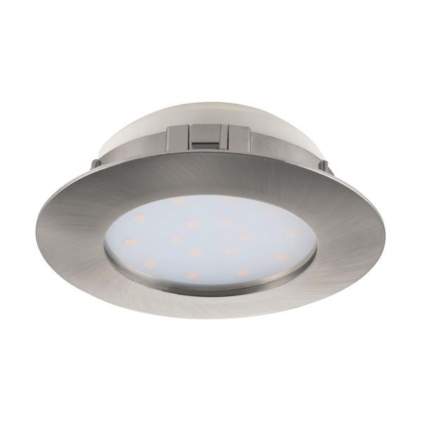 Diese Einbauleuchte der Serie PINEDA ist aus nickel-mattem Kunststoff gefertigt. Sie verfügt über eine Schutzisolierung und ist mit einem austauschbaren LED-Leuchtmittel, welches warmweißes Licht spendet, bestückt.