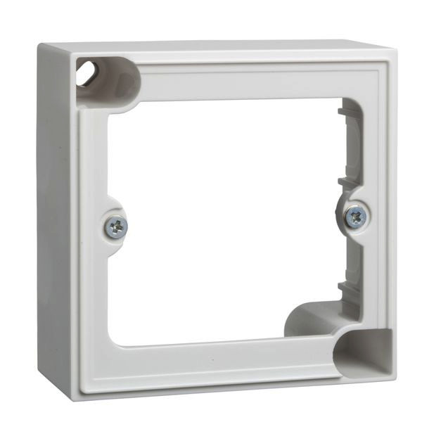 Aufputzgehäuse 1-fach, Farbe reinweiß zur Aufnahme der Unterputzgeräte bei Aufputzmontage, separater Rahmen erforderlich! mit Grundplatte Art. 274114 auch für brennbare Untergründe geeignet.