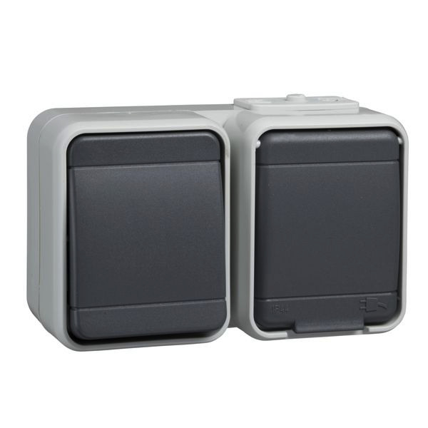 Universalschalter und Steckdose waagerecht. Farbe: licht-/basaltgrau, Kombinationen Schalter 10 A 250V AC/ Schutzkontakt-Steckdose 16 A 250V AC, für Aufputzmontage. Schutzart IP 44, mit zwei Leitungseinführungen, Schraubklemmen: Klemmbereichfür Kupferleiter 1,5 mm und 2,5 mm, für den sicheren Anschluss von Aluminiumleitern 2,5 mm ohne Vorbehandlung.