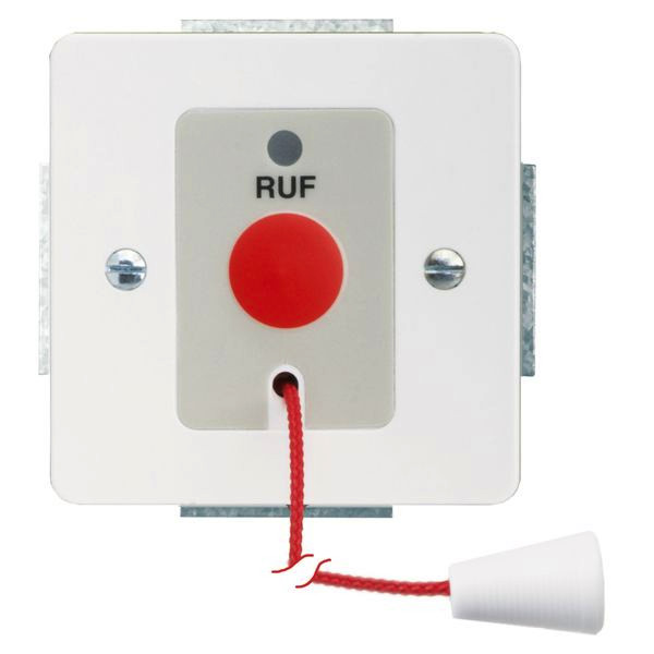 Ruftastereinsatz mit Zentralplatte für ELSO JOY, mit membranbeschichtetem Knopf und Beruhigungslicht, geliefert mit 2 m langer Zugschnur, der Taster wird in einem Aufputzrahmen oder in einer UP-Dose montiert Farbe reinweiß.
