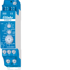 Heiz-Kühl-Relais mit 4 Kanälen, je 1 Schließer 4A/250V AC, potenzialgetrennt von der Versorgungsspannung, mit DX-Technologie. Bidirektional. Stand-by-Verlust nur 0,1 Watt. Reiheneinbaugerät für Montage auf Tragschiene DIN-EN 60715 TH35. 1 Teilungseinheit = 18mm breit, 58mm tief. Anschluss an den ELTAKO-RS485-Bus. Querverdrahtung Bus und Stromversorgung mit Steckbrücke. Mit der patentierten ELTAKO-Duplex-Technologie können die normalerweise potenzialfreien Kontakte beim Schalten von 230V-Wechselspannung 50Hz trotzdem im Nulldurchgang schalten und damit den Verschleiß drastisch reduzieren. Hierzu einfach den N-Leiter an die Klemme (N) und L an K(L) anschließen. Dadurch ergibt sich ein zusätzlicher Stand-by-Verlust von nur 0,1 Watt. Sind alle 4 Relais eingeschaltet, werden 0,7 Watt benötigt. Beim Ausfall der Versorgungsspannung wird definiert ausgeschaltet. Dieses Heiz-Kühl-Relais wertet die Informationen von Funk-Temperaturreglern oder -fühlern aus. Eventuell ergänzt um Fenster-Tür-Kontakte, Bewegungsmelder, Fenstergriffsensor FFG7B und Funktaster. Alternativ zu einem Funk-Temperaturregler kann die Temperaturinformation über Soll- und Istwerte auch von einem Controller bezogen werden. Weiterhin besteht die Möglichkeit, über den Controller die Solltemperatur vorzugeben und so den Einstellbereich der Funk-Temperaturregler einzuschränken. Oberer Drehschalter für die einstellbare Hysterese: Linksanschlag: kleinste Hysterese 0,5º. Mittelstellung: Hysterese 2,5º. Rechtsanschlag: größte Hysterese 4,5º. Dazwischen Unterteilung in 0,5º-Schritten. Mittlerer Drehschalter für die Regelungsarten: AUTO 1: Mit PWM-Regelung mit T = 4 Minuten (PWM= Pulsweiten-Modulation). (Geeignet für Ventile mit thermoelektrischem Stellantrieb). AUTO 2: Mit PWM-Regelung mit T = 15 Minuten. (Geeignet für Ventile mit motorischem Stellantrieb). AUTO 3: Mit 2-Punkt-Regelung. Unterer Drehschalter für die Betriebsarten: H: Heizbetrieb (Kontakte 1 bis 4). K: Kühlbetrieb (Kontakte 1 bis 4). HK: Heizbetrieb (Kontakte 3 und 4) und Kühlbetrieb (Kontakte 1 und 2). Im Heizbetrieb ist grundsätzlich die Frostschutzfunktion aktiv. Sobald die Ist-Temperatur unter 8°C fällt, wird in der gewählten Betriebsart auf 8°C geregelt. Solange ein oder mehrere Fenster offen sind, bleibt der Ausgang aus, sofern Fenster/Tür-Kontakte FTK oder Fenstergriffsensor FFG7B eingelernt wurden. Im Heizbetrieb bleibt aber der Frostschutz aktiv. Solange alle eingelernten Bewegungsmelder FBH keine Bewegung gemeldet haben, wird auf Absenkbetrieb geschaltet. Im Heizbetrieb wird die Soll-Temperatur um 2° abgesenkt, im Kühlbetrieb um 2° angehoben. Sobald ein Bewegungsmelder wieder Bewegung meldet, wird auf Normalbetrieb geschaltet. Ist ein Funktaster FT4 eingelernt, so ist die Belegung der 4 Tasten fest mit folgenden Funktionen belegt: Rechts oben: Normalbetrieb (auch per Schaltuhr aktivierbar). Rechts unten: Nachtabsenkbetrieb um 4°, im Kühlbetrieb Anhebung um 4° (auch per Schaltuhr aktivierbar). Links oben: Absenkbetrieb um 2°, im Kühlbetrieb Anhebung um 2°. Links unten: Aus (im Heizbetrieb Frostschutz aktiv, im Kühlbetrieb dauerhaft aus). Sind gleichzeitig Bewegungsmelder und Funktaster eingelernt, so gilt immer das zuletzt empfangene Telegramm. Ein Bewegungsmelder schaltet bei Bewegung folglich einen mit dem Funktaster gewählten Absenkbetrieb wieder aus. Die LED unter dem oberen Drehschalter begleitet den Einlernvorgang gemäß Bedienungsanleitung und zeigt im Betrieb Steuerbefehle durch kurzes Aufblinken an.