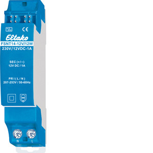 Schaltnetzteil Nennleistung 12W. Stand-by-Verlust nur 0,1 Watt. Reiheneinbaugerät für Montage auf Tragschiene DIN-EN 60715 TH35. 1 Teilungseinheit = 18mm breit, 58mm tief. Ist der Gesamt-Leistungsbedarf eines Baureihe14-Bussystems höher als 8W, sind weitere Schaltnetzteile FSNT14-12V/12W erforderlich. Diese versorgen jeweils eine Gruppe von Aktoren, welche mit einer Trennbrücke auf dem FSNT14 getrennt werden. Im Lieferumfang enthalten sind 1 Trennbrücke TB14 1 TE, 1 Steckbrücke 1,5 TE und ein Distanzstück DS14. Bei einer Belastung größer 50% der Nennleistung und immer bei nebeneinander liegenden Schaltnetzteilen und Dimmern ist 1/2 Teilungseinheit Lüftungsabstand mit dem Distanzstück DS14 erforderlich. Dieses und eine lange Steckbrücke liegen daher bei. Eingangsspannung 230V (-10% bis +10%). Wirkungsgrad 87%. Stabilisierte Ausgangsspannung ±1%, geringe Restwelligkeit. Kurzschlussfest. Überlast- und Übertemperatursicherung durch Abschalten mit automatischem Zuschalten nach der Fehlerbeseitigung (Autorecovery-Funktion). Dieses Schaltnetzteil kann auch zur Herstellung einer Redundanz verwendet werden. Dazu darf jeweils nur 1 FSNT14 parallel zu den integrierten Stromversorgungen in den FAM14 und FTS14KS angeschlossen und mit einer normalen Steckbrücke verbunden werden. Das FSNT14 sollte dabei zur optimalen Lastaufteilung möglichst neben den letzten Aktor im Bus gesetzt werden.