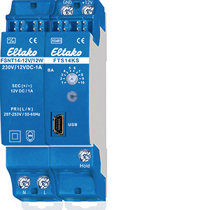 FTS14-Kommunikationsschnittstelle für den Eltako-RS485-Bus mit integriertem Schaltnetzteil 12V DC/12 W. Stand-by-Verlust nur 0,6 Watt. Reiheneinbaugerät für Montage auf Tragschiene DIN-EN 60715 TH35. 2 Teilungseinheiten = 36mm breit, 58mm tief. Versorgungsspannung 230V. Im Lieferumfang enthalten sind 2 Abschlusswiderstände zum Aufstecken mit Aufdruck ?, 1/2 TE, 3 Steckbrücken 1 TE (davon 1 Ersatz), 2 Steckbrücken 1/2 TE (davon 1 Ersatz). Querverdrahtung Bus und Stromversorgung mit Steckbrücke. Am letzten Aktor muss der beiliegende zweite Abschlusswiderstand aufgesteckt werden. Mini-USB zum Anschluss eines PC zur Erstellung einer Geräteliste, zur Konfiguration der Aktoren mit Hilfe des PC-Tools PCT14 und zur Datensicherung. Ein Legalisierungs-Code für den Download des PCT14 von der Eltako-Homepage www.eltako.de liegt dem FTS14KS bei. An die Klemme Hold werden alle FTS14EM und ggf. Gateways FGW14 angeschlossen, wenn diese einen PC mit RS232-Bus verbinden. Mit dem Betriebsarten-Drehschalter BA lassen sich 10 unterschiedliche Betriebsarten gemäß Bedienungsanleitung einstellen. Die LED unten leuchtet grün, wenn vom PC-Tool PCT14 eine Verbindung hergestellt wurde. Beim Lesen oder Schreiben von Daten flackert die grüne LED. Die grüne LED erlischt, wenn vom PC-Tool PCT14 die Verbindung getrennt wurde. Bei einer Belastung größer 50% der Nennleistung von 12W ist auf der linken Seite eine halbe Teilungseinheit Lüftungsabstand mit dem Distanzstück DS14 erforderlich.