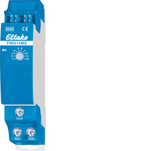 Wetterdaten-Gateway für Wetterdaten-Multisensor WMS. Bidirektional. Stand-by-Verlust nur 0,3 Watt. Reiheneinbaugerät für Montage auf Tragschiene DIN-EN 60715 TH35. 1 Teilungseinheit = 18mm breit, 58mm tief. An das Gateway wird ein Wetterdaten-Multisensor WMS an die Klemmen RSA und RSB angeschlossen. Dessen Informationen werden einmal pro Sekunde empfangen und in Bus-Telegramme umgewandelt. An ein FWG14MS kann nur 1 Wetterdaten-Multisensor WMS angeschlossen werden. Es können jedoch mehrere FWG14MS an einen Wetterdaten-Multisensor WMS angeschlossen werden, um z.B. mehrere ELTAKO-RS485-Busse mit nur einem Wetterdaten-Multisensor WMS anzusteuern. Nur bei einem FWG14MS muss der außenliegende Abschusswiderstand vorhanden sein. Bei weiteren FWG14MS muss er dagegen entfernt werden. Anschluss an den ELTAKO-RS485-Bus. Querverdrahtung Bus und Stromversorgung mit Steckbrücke. Betrieb in Verbindung mit FAM14 oder FTS14KS. Die Hold-Klemme wird mit dem FAM14 oder FTS14KS verbunden. Bis zu zwei FWG14MS können in einem Bus betrieben werden. Mit dem Telegramm-Duplizierer FTD14 können die Telegramme auch in den Gebäudefunk gesendet werden, wenn die IDs der FGW14MS in den FTD14 eingelernt oder mit PCT14 eingetragen werden. Empfangsgeräte können dann FSB14, FSB61NP und FSB71 sein. Bleibt das Signal des Wetterdaten-Multisensors WMS aus, wird ein Alarm-Telegramm gesendet. Mit dem PC-Tool PCT14 können 96 Eingänge UND bzw. ODER verknüpft und auf bis zu 12 Ausgängen ausgegeben werden. Die Einstellungen des Betriebsarten-Drehschalters BA erfolgen gemäß Bedienungsanleitung.