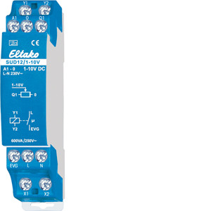 1 Schließer nicht potenzialfrei 600VA und 1-10V-Steuerausgang 40mA. Stand-by-Verlust nur 0,5 Watt. Reiheneinbaugerät für Montage auf Tragschiene DIN-EN 60715 TH35. 1 Teilungseinheit = 18mm breit, 58mm tief. Modernste Hybrid-Technik vereint die Vorteile verschleißfreier elektronischer Ansteuerung mit hoher Leistung von Spezialrelais. Das Steuergerät SUD12 kann in zwei Schaltungsarten verwendet werden. Schaltungsart 1-10V-Ausgang: In dieser Schaltungsart können, in Verbindung mit einem Universal-Dimmschalter EUD12D bzw. MFZ12PMD elektronische Vorschaltgeräte und Trafos mit einer 1-10V-Schnittstelle bis zu 40mA Gesamt-Steuerstrom angesteuert werden. Der EUD12D bzw. MFZ12PMD wird mit Tastern am Universal-Steuerspannungs-Eingang örtlich und ggf. zentral gesteuert und veranlasst das SUD12 über die Anschlüsse Y1/Y2 zur Regelung des 1-10V-Ausganges 0/Q1 für die Schnittstelle. Die Ein- und Ausschaltung der Last erfolgt mit einem bistabilen Relais am Ausgang EVG. Schaltung im Nulldurchgang zur Kontaktschonung. Schaltleistung Leuchtstofflampen oder NV-Halogenlampen mit EVG 600VA. Durch die Verwendung eines bistabilen Relais gibt es auch im eingeschalteten Zustand keine Spulen-Verlustleistung und keine Erwärmung hierdurch. Nach der Installation die automatische kurze Synchronisation abwarten, bevor der geschaltete Verbraucher ans Netz gelegt wird. An den Universal-Dimmschalter EUD12D kann gleichzeitig eine direkt dimmbare Lampe angeschlossen werden. Außerdem kann der Universal-Dimmschalter EUD12D bzw. MFZ12PMD mit Leistungszusätzen LUD12 für direkt dimmbare Lampen und Leuchten erweitert werden, wie auf Seite 9-7 beschrieben. Schaltungsart 1-10 V-Eingang: In dieser Schaltungsart kann, in Verbindung mit einem an die Anschlüsse X1/X2 angeschlossenen Leistungszusatz LUD12, der Ausgang eines 1-10V-Steuergerätes an A1/0 in eine direkte Dimmfunktion umgesetzt werden. Das Ein- und Ausschalten erfolgt ebenfalls extern an L des SUD12. Der Drehschalter des LUD12 muss unbedingt in die Stellung zusätzliche Leuchten gestellt werden. An das Steuergerät SUD12 können weitere Leistungszusätze LUD15 in der Schaltungsart Leistungserhöhung mit zusätzlichen Leuchten angeschlossen werden. An den Steuereingang A1/0 kann auch direkt ein 100K-Potentiometer zur Helligkeitsregulierung angeschlossen werden. Wird der Eingang A1/0 getrennt, dimmt der LUD12 auf maximale Helligkeit.