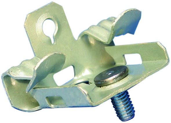 Befestigungselement zum Aufschlagen, zur Gewindestiftbefestigung von Gerätedosen, Vorrichtungen und and. Anwendungen an Trägerflanschen. Federstahlbefestigung, wird an Flanschen von 8 bis 14 mm befestigt, mit M6 x 11mm Gewindestift.