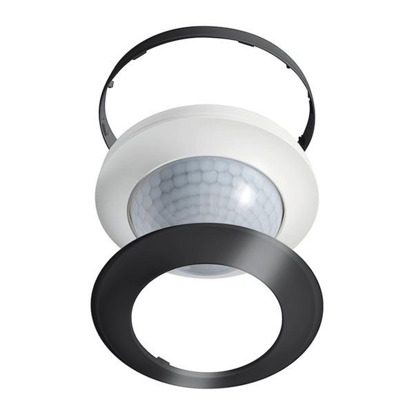 Abdeck-Set in schwarz bestehend aus Abdeckblende und Designring für viele Decken-Bewegungsmelder der Serie COMPACT und Decken-Präsenzmelder der Serie COMPACT.