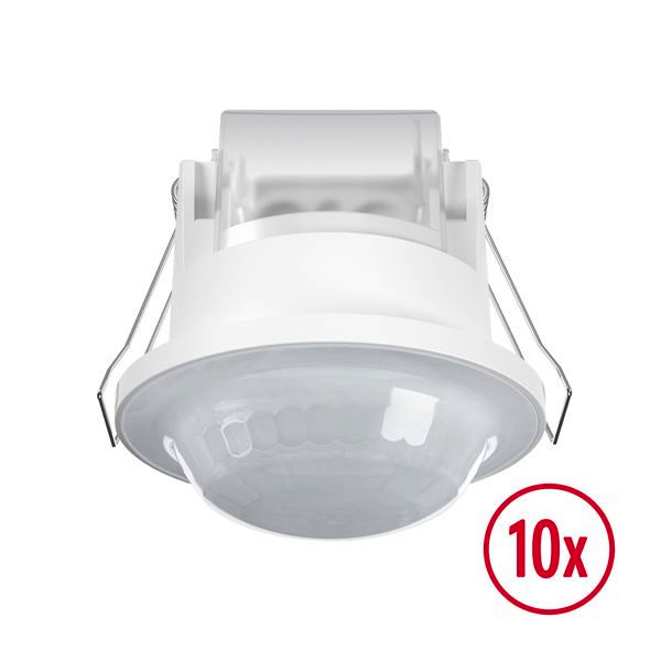 Präsenzmelder im Set mit 360° Erfassungswinkel für den Deckeneinbau. Reichweite von bis zu 8 m im Durchmesser bei einer empfohlenen Montagehöhe von 2,5 m. 10 A Hochleistungsrelais. Nulldurchgangsschaltung: Verlängerung der Lebensdauer von Relais und Leuchtmittel bei elektronischen Vorschaltgeräten (z.B. Fluoreszenzleuchten, LED) durch schonendes Schalten im Nulldurchgang. Werkseinstellung für eine sofortige Betriebsbereitschaft. Einfaches Parametrieren per Fernbedienung oder mit ESY-Pen und ESY-App. Automatische Lichtsteuerung. Zusätzlicher Tastereingang. Erweiterung des Erfassungsbereichs durch Parallelschaltung.