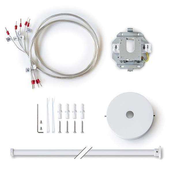 Abhängeset mit zentral montiertem Rohr (Länge: 1 m), transparenter 5-poliger Anschlussleitung (Länge: 1,2 m) und rundem Deckenbaldachin. Rohr für Leuchtenmontage kürzbar mit einem Abstand zur Decke zwischen 0,2 und 1 m.