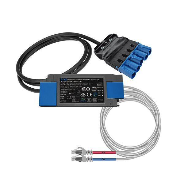 Plug-and-play LED-Treiber Set DALI-2 DT8 für Tunable White ESYLUX Satelliten LED-Leuchten. Ausgangsstrom 700 mA. Primärseitig am Treiber: 0.5 m schwarzes Kabel mit 5-poligem schwarz/blauem Stecker WIELAND GST. Sekundärseitig am Treiber: 0.5 m blau markiertes Kabel (kaltweißer Kanal) und 0.5 m rot markiertes Kabel (warmweißer Kanal) mit RJ45 Steckern .