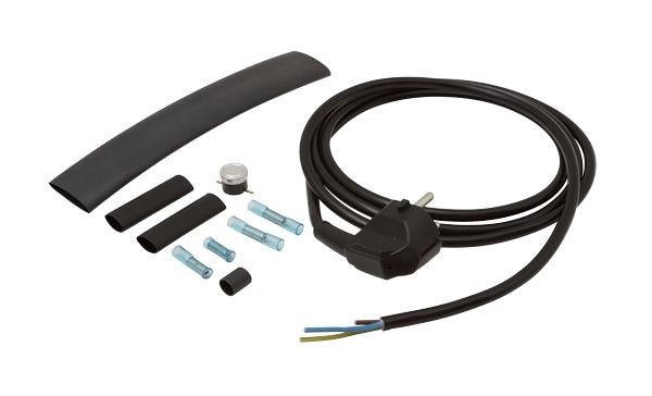 Werkseitige Konfektionierung von maßangefertigten Rohrbegleitheizbändern mit Thermostat in Anschlussmuffe, inkl. 2 m Steckerleitung und Endabschluss. Das Thermostat ist zu 100 % feuchtigkeitsgeschützt und schaltet den Frostschutz bei Gefahr unter +3 °C ein und bei +10 °C wieder aus.