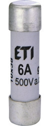 Sicherungseinsatz, CH10x38 gG 8A/500V, Anwendung zum Kabelschutz, Abschaltleistung AC (kA) 100, Charakteristiken gG, Abmessungen 10X38, Pd (W) 1,1, Bemessungsspannung AC 500, Bemessungsstrom (A) 8, Größe CH10, Standard IEC 60269-1, IEC 60269-2, Typ CH