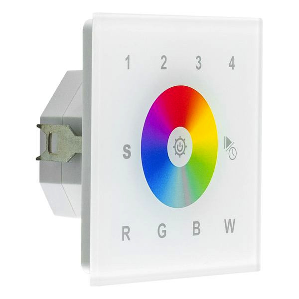 DMX-Wandpanel für die Ansteuerung der DMX-Controller. Steuerung von bis zu 4 separaten Zonen (Controllern). Für Schalterdosenmontage geeignet. Funktionen: Farbwechsel über Touch-Farbrad, Direktfarbwahl (rot, grün, blau und weiß), Ein- und ausschalten, so wie Programmwechsel. Technische Daten: ta: -20 - 50°C, tc: 75°C.