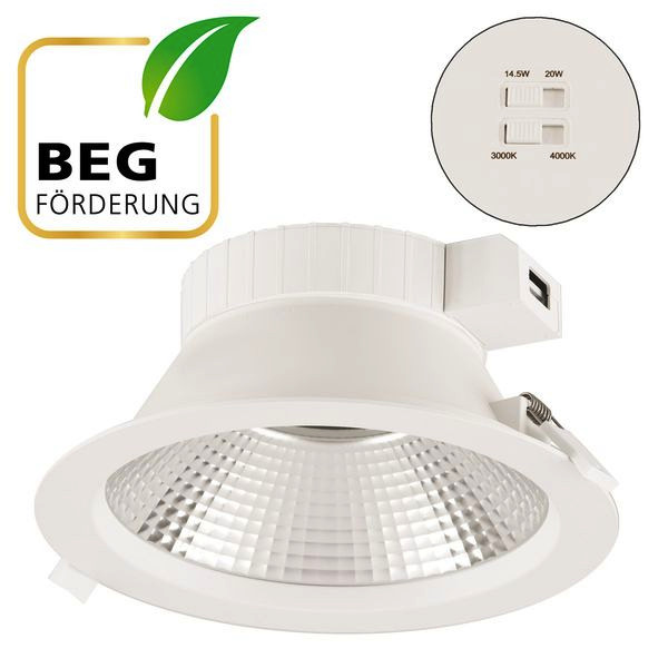LED Deckeneinbauleuchte für verschiedene Anwendungsbereiche, wie z. B. flächendeckende, aber auch effektvolle Beleuchtungen in Flur, Wohnzimmer, Büro und vieles mehr. Aufgrund der gegebenen Schutzart und der UV-Beständigkeit kann die Leuchte auch im geschützten Außenbereich problemlos eingesetzt werden. Die Leuchte verwendet als Lichtquelle ein hocheffizientes LED-Modul, welches über Bajonettverschluss mit dem Leuchtengehäuse verbunden ist. Dies ermöglicht einen nachhaltigen Tausch der Lichtquelle. Die Leuchte kann außerdem auch über eine Zentralbatterie betrieben werden, mit einer Eingangsspannung von 178-260V/DC. Mit dem rückseitig angebrachten Schalter kann eine von zwei möglichen Farbtemperaturen eingestellt werden. Außerdem kann die Leistung über einen Dip-Schalter eingestellt werden. Die möglichen Farbtemperaturen und daraus resultierenden Lumen unter Berücksichtigung der einstellbaren Leistung sind: 14,5W: 3000K (2091lm), 4000K (2114lm) und 20W: 3000K (2690lm), 4000K (2735lm). Die Leuchte ist zudem Flickerfree.