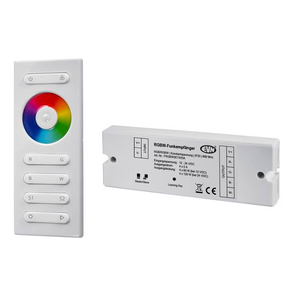Funk-Controller-Set für RGB- und RGBW LED-Leuchten. Neben der Farbsteuerung ist es über das Set auch möglich die Leuchte zu dimmen, oder ein- und aus zu schalten. Ebenso können verschiedene Farbwechselmodi, sowie die gewünschte Geschwindigkeit für den Farbwechsel gesteuert werden. Die Farbwahl über den Handsender erfolgt mittels Touch-Farbrad, wobei die Grundfarben rot, grün, blau und weiß auch direkt angewählt werden können. Außerdem können 2 Szenen fest gespeichert werden. Geeignet für 12 und 24V/DC Leuchten. Anschlüsse: 1x Eingang und 4x Ausgang (+RGBW). Maximale Ausgangsleistung je Kanal: 5A, 60W bei 12V/DC und 120W bei 24V/DC. Beim Einsatz mehrerer Sets innerhalb eines Raumes können diese als Master-Slave-Anwendung synchron gesteuert werden. Es können bis zu 20 Empfänger auf einen Handsender und bis zu 5 Handsender auf einen Empfänger eingelernt werden. ta: 0-40°C.