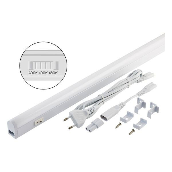 Die Leuchte ist perfekt für den Einsatz in Küchen als Unterbauleuchte an Hängeschränken geeignet, kann aber ebenso auch als Decken-, oder Wandleuchte verwendet werden. Der Anschluss erfolgt über die mitgelieferte, 180cm lange, Eurozuleitung. Es können mehrere Leuchten mittels mitgeliefertem Direktverbinder oder Verbindungsleitung (15cm) verbunden werden. Die Gesamtleistung der miteinander verbundenen Leuchten darf 100W nicht überschreiten. Mittels Schalter kann eine von drei möglichen Farbtemperaturen eingestellt werden. Die möglichen Farbtemperaturen und daraus resultierenden Lumen sind: 3000K (1185lm), 4000K (1350m) und 6500K (1198lm).Alle benötigten Befestigungen, sowohl für Wand- als auch Deckenmontage, sind im Lieferumfang enthalten. ta: 10°C - 30°C.