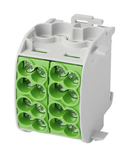 HLAK1p25Dgrgn; Hauptleitungsabzweigklemme, 1-polig, 25 mm²/Doppelblock ("L"); Zugang 4 x 16 mm², Abgang 4 x 25 mm²; Anschlüsse zertifiziert nach DIN VDE 0603-2; Mit Schnappbefestigung für waagerechte Montage