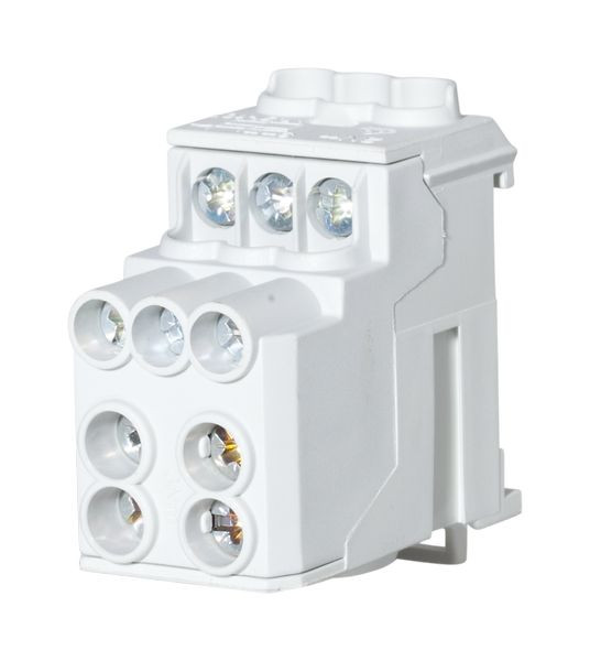 Unterverteilungsblock. Anzahl Pole 1. Einspeiseklemmstellen: 2x 2,5 - 25 mm². Verteilerklemmstellen: 6x 1,5 - 10 mm². passend für: CU-/AL-Leiter. Farbe grau.