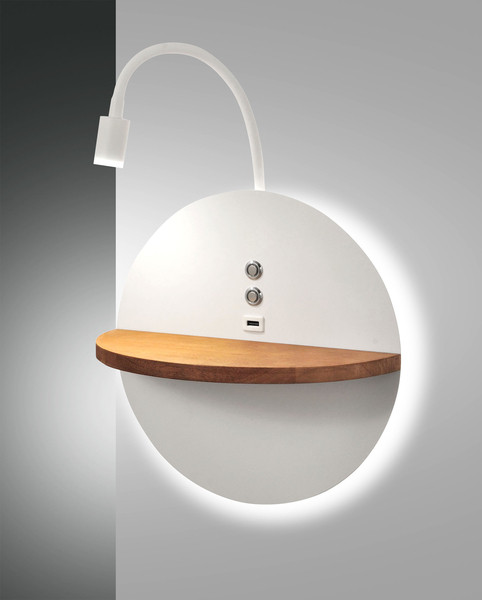Funktionelle dimmbare LED Wand-Leseleuchte mit massiver Holzablage, USB-Ladebuchse und getrennt dimm- und zuschaltbarem Backlight, Direktanschluss