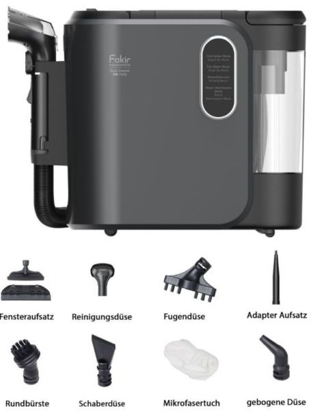 multifunktionaler Dampf- und Fleckenreiniger, Steuerung über LED-Bildschirm mit Sprachausgabe (englisch), 4 Reinigungsmodi: Heißwassermodus, Kaltwassermodus, Dampf und Vakuummodus und Dampfmodus; Aufheizzeit 30 Sek., 2 Wassertankbehälter: abnehmbarer Frischwassertrank 1.600 ml und abnehmbarer Schmutzwassertank 1.300 ml, umfangreiches Zubehör: Kupfer Rundbürste, kleine Rundbürste, gebogene Düse, Fensterreinigungsdüse, Schaberdüsenaufsatz, Fugenbürste, Mikrofasertuch, Aktionsradius 6,6 m, Kabel- und Schlauchhalterung